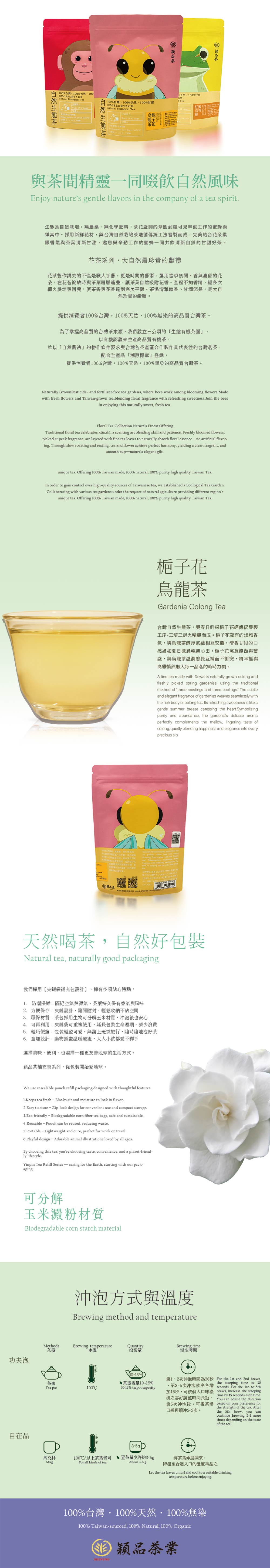 梔子花烏龍茶/3.0g/袋/12入 台灣生態茶與春日鮮採梔子花三焙三退火窨製,淡雅花香與烏龍茶韻交織,清香甘甜如夏日微風。梔子花寓意純潔繁盛,與茶香交融,品茗間悄然傳遞幸福與高雅。 成份:烏龍茶 梔子花 產地:台灣 NT $320 加入購物車 直接購買 ※購買本商品,付款後預計3個工作天(不含假日)出貨。 產品介紹 回上一頁